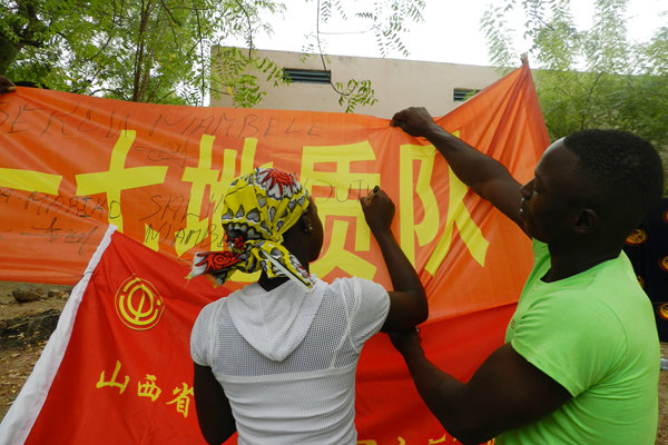 活動(dòng)中孩子們穿著合身的衣服,背著嶄新的書包歡呼雀躍。他們把我隊(duì)項(xiàng)目組的小伙子們緊緊圍繞,問(wèn)長(zhǎng)問(wèn)短,歡聲笑語(yǔ)不斷從小院傳至DOGO鄉(xiāng)村的角角落落。禮品贈(zèng)送完畢,大家又進(jìn)行了簽名活動(dòng),無(wú)論大人還是孩子,無(wú)論會(huì)不會(huì)寫字都留下了屬于自己的痕跡。整個(gè)村莊沉浸在喜氣洋洋、快樂(lè)祥和的氣氛中。